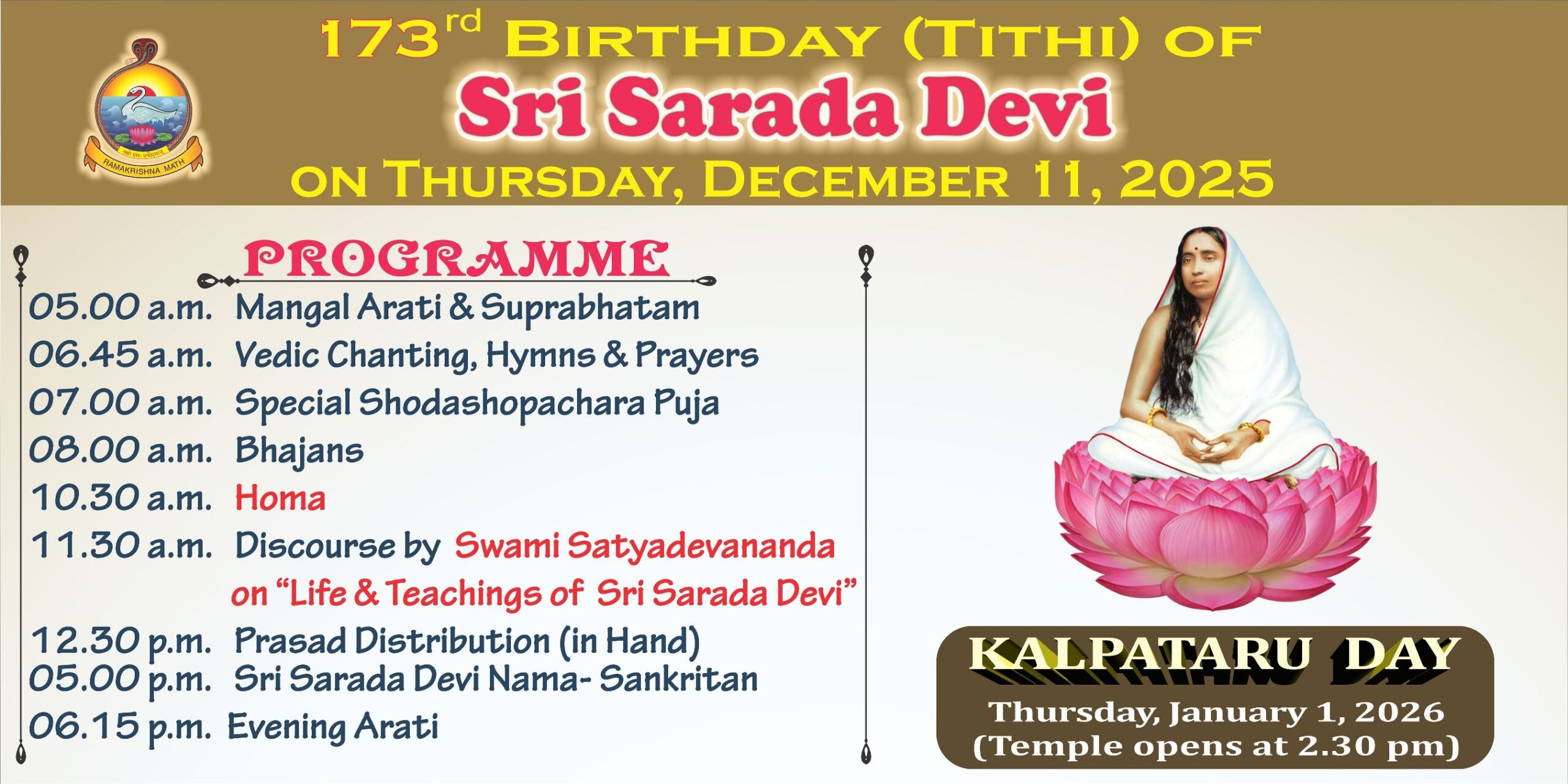 Holy Mother Tithi Puja will be celebrated on Thursday, 11 December 2025.