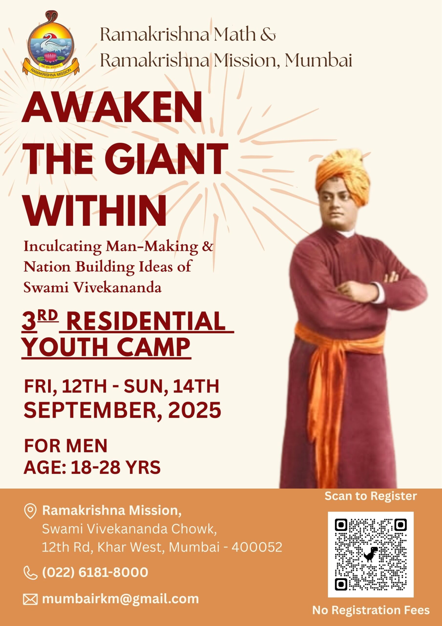Awaken the Giant Within is the 3rd Residential Youth Camp organized by Ramakrishna Mission, Mumbai — a 3-day immersive program designed for young men aged 18 to 28. *Limited to 50 participants only.