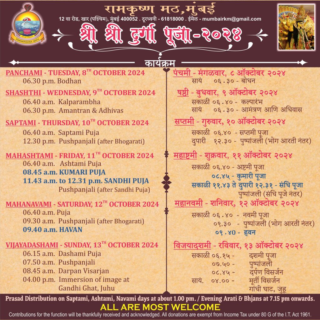 Sri Sri Durga Puja will be celebrated at the Ramakrishna Math & Ramakrishna Mission premises from Wednesday, 9th October 2024 to Sunday, 13th October 2024 as per the given programme details. All are cordially invited to attend the puja and other functions.