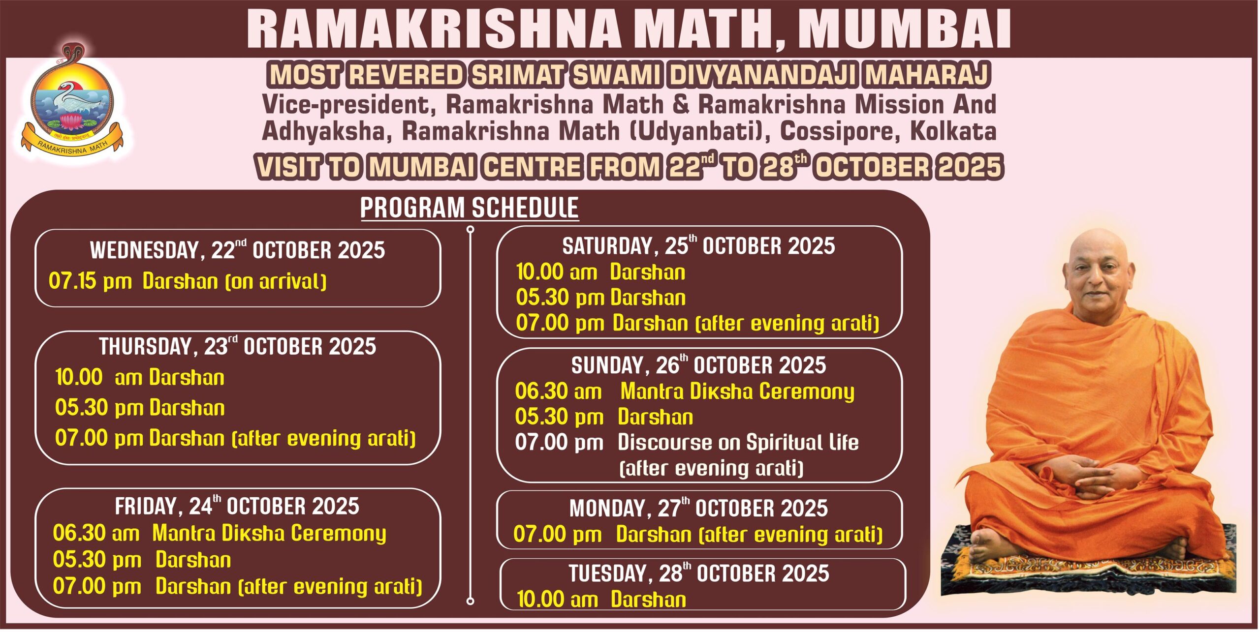 We are happy to announce the visit of Revered Swami Divyanandaji Maharaj, Vice-President, Ramakrishna Math and Ramakrishna Mission, Belur Math. He has kindly consented to initiate (Mantra Diksha) the seekers of spiritual life on the 24th & 26th of October 2025.